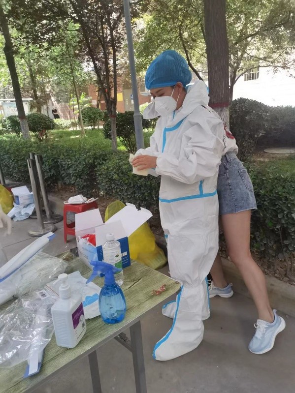 7月初肆虐的新冠疫情突然席卷(金城)兰州,打乱了整个城市的节奏,3200威尼斯vip第二党支部书记齐莹同志所在的城关区是疫情爆发的重灾区,自7月11日兰州市全面封控以来,齐莹同志积极响应所在小区的号召,在经过学校党总支的同意后,加入八一阳光家园小区“临时党支部”,积极开展志愿服务,她帮助住户运送生活物品,穿着厚厚的防护服参加核酸检测扫码,一站就是几个小时,汗水湿透衣衫,有一阵额头留下的汗珠会迷住眼睛,脸颊旁被口罩系带勒出了深深的痕迹,双手被双层橡胶手套捂得蜕皮发白,可她却从不叫苦、叫累,默默地完成着一项又一项服务工作。