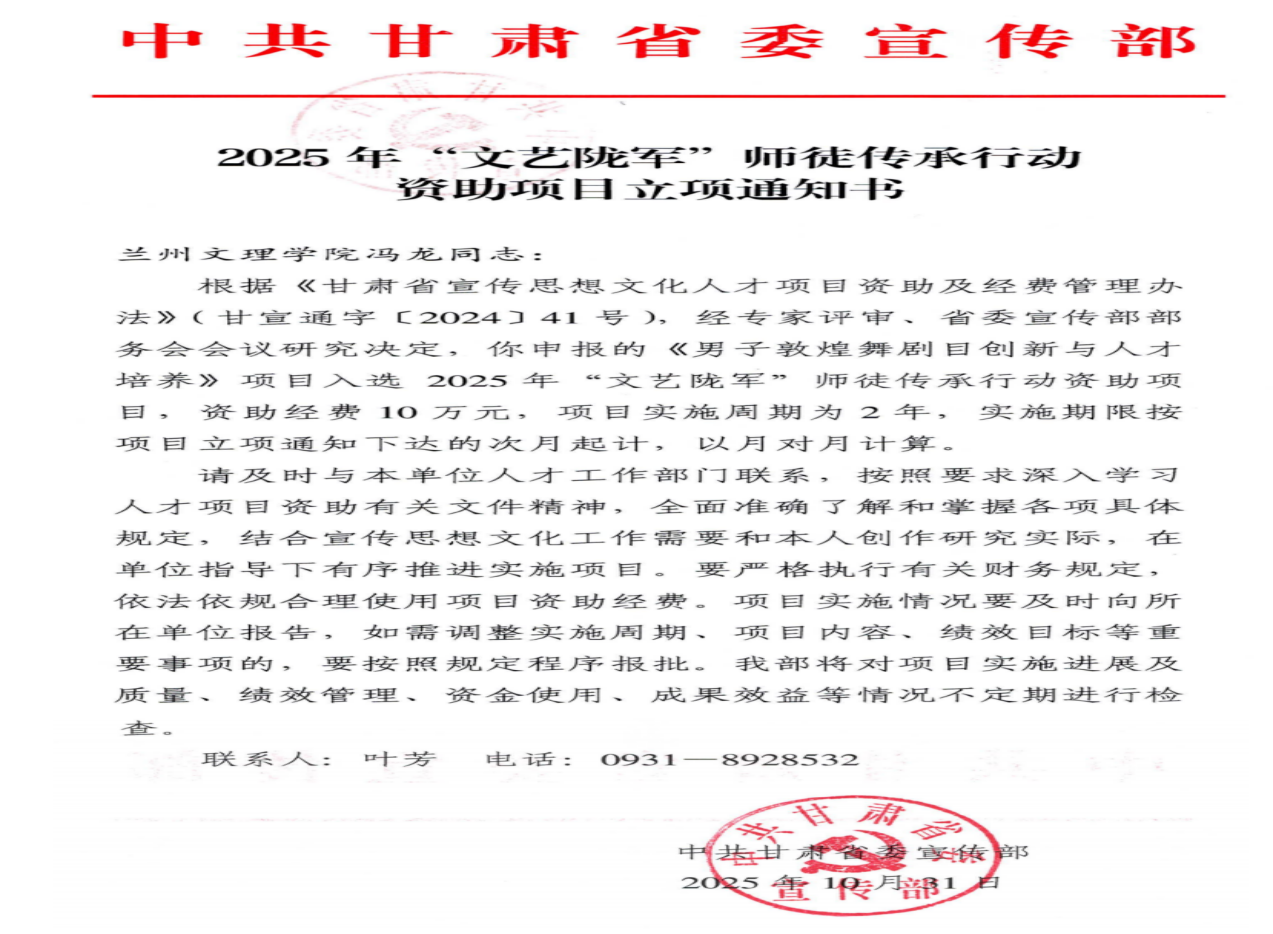 近日中共甘肃省委宣传部公布了2025年“文艺陇军”师徒传承行动资助项目立项通知书,我院冯龙老师申报的《男子敦煌舞剧目创新与人才培养》成功立项,资助金费10万元。此次资助将进一步助力学院在敦煌舞等传统艺术的传承与创新方面取得突破。值得一提的是,这是继2023年成功获批该项目资助之后,3200威尼斯vip再次获得此项资助,这一连续性的资助充分体现了学校在舞蹈艺术创作和文化传承领域深厚的实力和广泛的社会影响力。